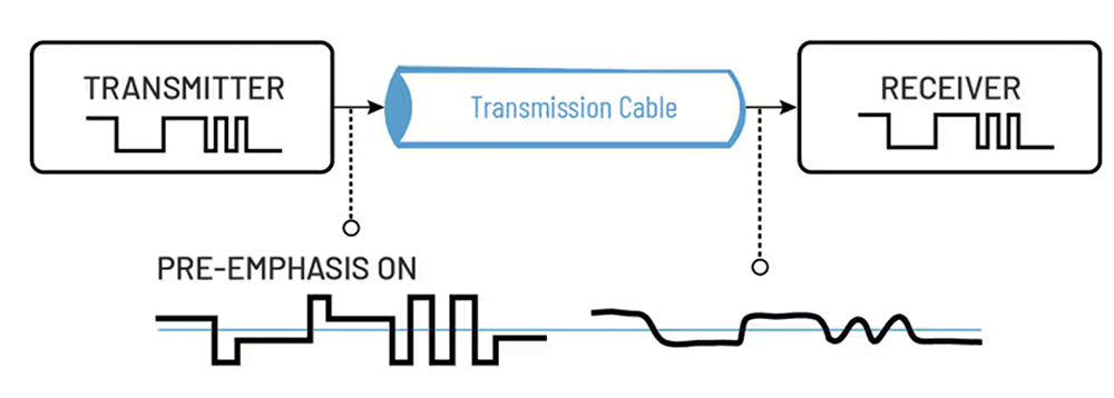 Pre-emphasis tackles the same underlying challenge, but from the opposite direction; the transmitter. Since cables attenuate high frequency components the most, pre-emphasis intentionally boosts those frequencies before the signal even enters the wire. As the signal travels, the channel naturally attenuates these boosted components, bringing them back down toward their nominal levels by the time they reach the receiver.