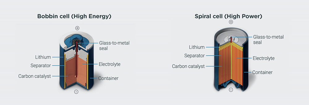 Two construction types are available. LS and LSP cells use a bobbin construction, while LSH cells use a spiral construction, allowing the range to cover very different power profiles.