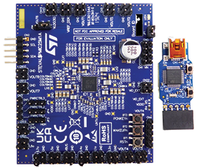 The STEVAL-PMIC25V1 is a power management IC evaluation board for the highly integrated STPMIC25, which is designed to manage the power requirements of the core, memory, and interfaces of the STM32MP2x series MPU and other application microprocessors. The kit includes a USB dongle, which provides I2C access to the configuration registers of the STPMIC25 device, where voltage settings, power sequences, protection thresholds, and other parameters can be set.