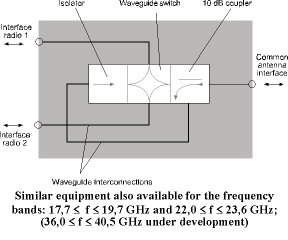 The actual operating transceiver is directly routed through the switch and the coupler to the antenna port with inherently low insertion loss (less than 0,7 dB) mainly resulting from the coupler insertion loss. Functionality of the redundant transceiver is ensured by steadily monitoring the 10 dB receiver signal and the transmitter output signal that is attenuated within the isolator. If the operating transceiver fails, the dedicated direct and redundant waveguide paths of the waveguide circuitry are interchanged by controlling the waveguide switch and service is immediately taken over by the 'hot-standby' equipment. The complete waveguide circuitry is assembled within a housing that allows direct mounting and interfacing to the feeder port of an antenna without the need of additional waveguide hardware.