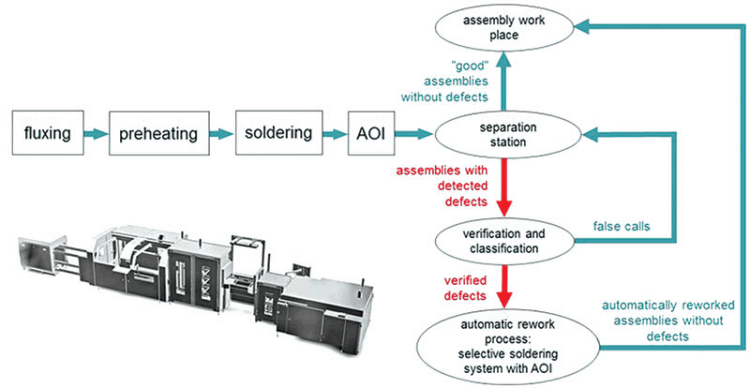 A controlled and reliable process is a basic requirement for approaching zero-fault production. Besides the selective mini-wave soldering process with monitoring and control functions for all process steps, the zero-fault production concept incorporates integrated automated optical inspection (AOI) of the solder joints, as well as a defined and automated rework soldering process at the fault coordinates, corresponding to the fault classification.