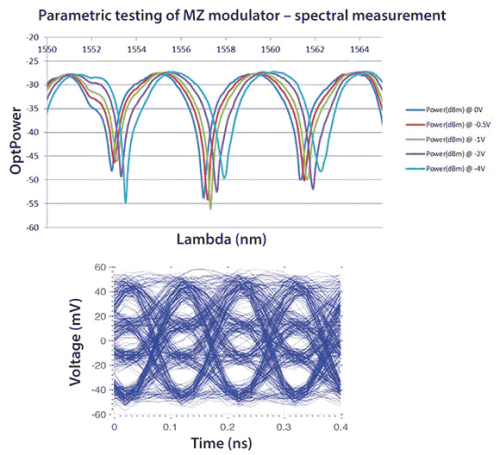 Wafer-level testing can also include functional testing from the start, if the design of the device allows it. For example, an MZ interferometer can be used as a modulator directly on the wafer and functionally tested by using a BERT and sampling scope to analyse the resulting eye diagram – this to further reduce the risk of integrating a defective chip.