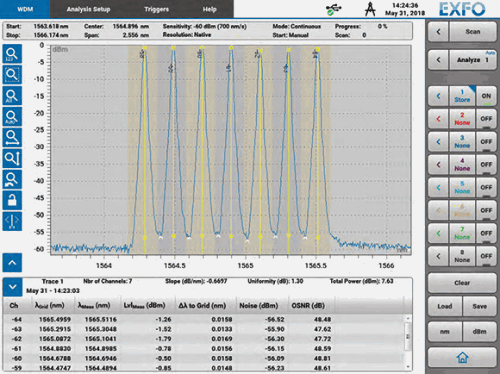 An OSA can be used to perform tests on active components simply by connecting the light source or laser output to the OSA to get the spectral signal of the sources, as seen on the right of Figure 4. Leading OSAs have the advantage of being very fast, performing up to five scans per second at speeds of 2000 nm/s, fast enough for real-time component alignment and with a high enough resolution to allow measurement of key parameters such as OSNR and SMSR.
