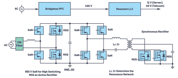 GaN transistors can enable most AC-DC power supplies that consist of separate power factor correction (PFC) and DC-to-DC sections: a front-end, bridgeless PFC and the following LLC resonant converter (two inductors and one capacitor). This topology exclusively relies on half-bridge and full-bridge circuits as shown in Figure 1.