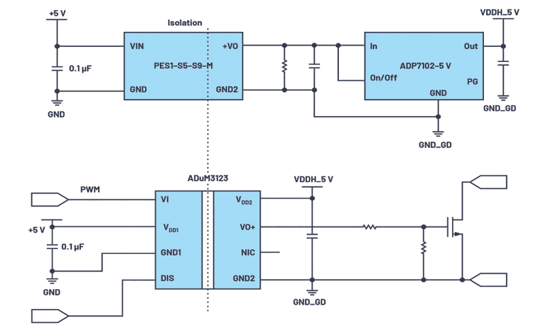 In the long term, the driver for GaN systems may enable its implementation into smaller size isolator modules. Tiny, single-channel examples such as the ADuM110N (low propagation delay, high frequency) and the isoPower ADuM5020, which offer simplicity in design, as shown in Figure 4, support this trend.