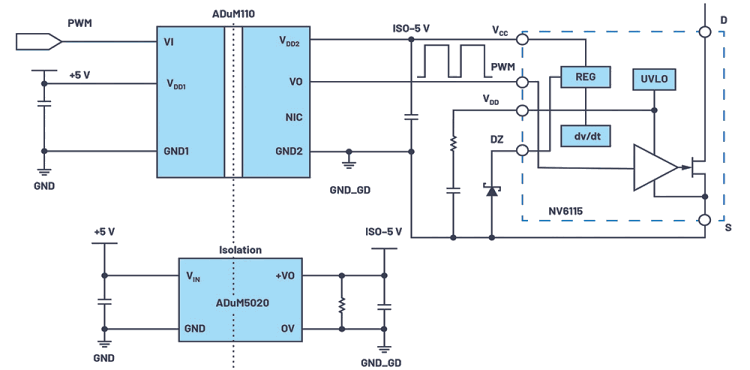 Single-channel drivers are ready for GaN transistors. A typical single-channel driver is the ADuM3123, using external power supplied by Zener diodes and discrete circuits for negative bias (optional) as shown in Figure 3.