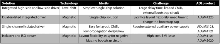 There are several solutions to drive both the high-side and low-side of the half-bridge transistor. One myth about the traditional, level-shifted, high-voltage driver is that the simplest single-chip implementation is widely used only for silicon-based MOSFETs. In some high-end products (for example, power supply for servers), the ADuM4223 dual-isolated driver is used to drive a MOS for compact designs.