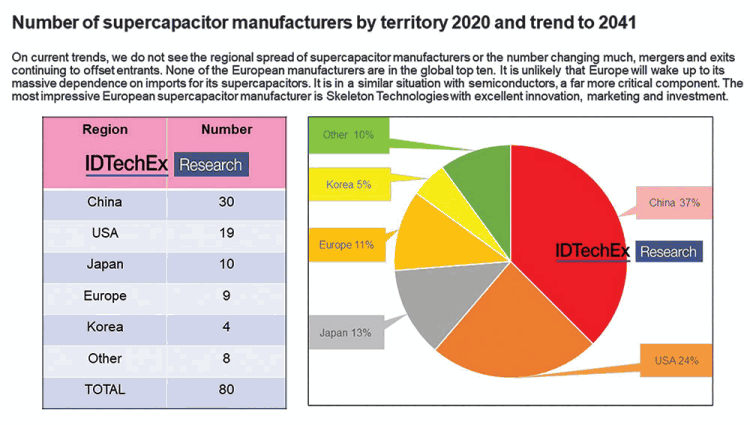 Chapter 3 sees all 80 supercapacitor manufacturers critically appraised, not just a directory. Companies with large sales or breakthrough products get special attention, such as Evans Capacitor with a recent $7 million order and unique virtuosity. View ten columns over 53 densely packed pages based on global visits, interviews, original photographs, and much original data. See split by country, capacitor size, technologies, time, where China is leading/ lagging progress in technology or application, high margin vs. commoditised.