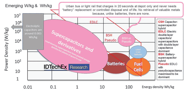 What do you now purchase by the kilowatt hour? The new supercapacitors replacing batteries. The new IDTechEx report, ‘Supercapacitor Markets, Technology Roadmap, Opportunities 2021-2041’, shows how supercapacitors have started to replace 10% of lithium-ion batteries and help kill lead-acid.