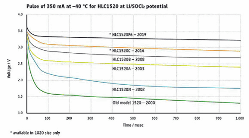 Figure 1 shows the development of the Tadiran HLC performance over the years when undergoing a pulse of 350 mA at -40°C.