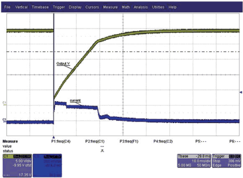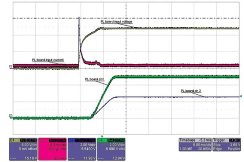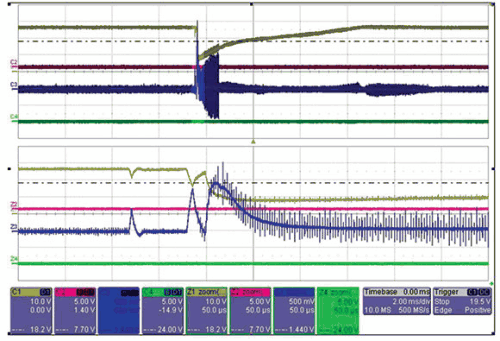 In the waveforms shown in Figure 2, the blue trace shows the current supplied by the AC-DC power supply as a discharged, low-impedance capacitor is switched onto the established output. As you can see, the power supply has turned on three times – this happens because the relay bounces. At just under 60 A, there’s about 700 W being drawn from the power supply, which could cause a standard power supply to hiccup, thus preventing correct start-up of the load. In this case, however, the output does recover as can be seen by the yellow trace.