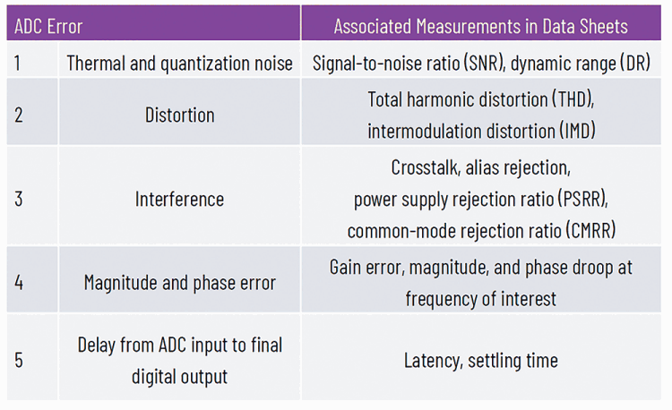 For DC or near-DC applications such as power metering dealing with 50 Hz to 60 Hz input signals, ADC errors such as offset, gain, INL and flicker noise would have to be accounted for. These DC performance parameters also require a certain level of temperature stability relating to an application’s intended use.