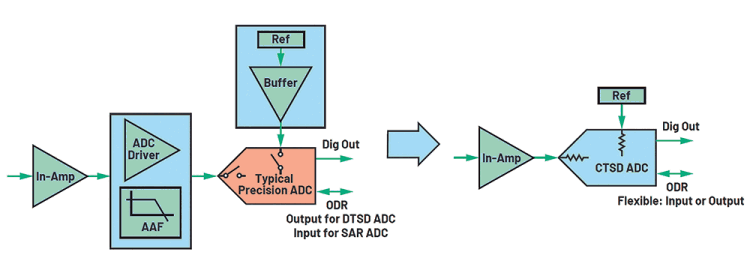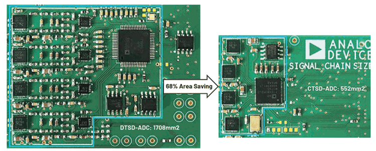 Continuous-time sigma-delta (CTSD) architecture, which has been predominantly used in audio and high-speed ADCs, is being tailored for precision applications to achieve the highest precision while leveraging its unique signal chain simplification properties. The advantages of this architecture remove the burdens involved with designing the periphery. Figure 2 shows a small snippet of how current ADC signal chains can be simplified and shrunk by 68% by using this new solution to enable high channel densities.