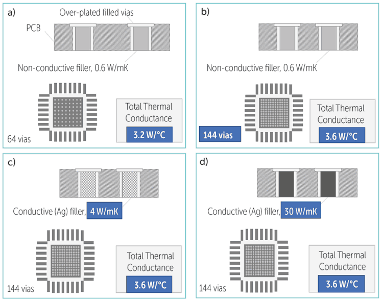 There are limits to the effectiveness of heat transfer using a traditional ground pad with PTHs. Figure 2 shows the results of calculations of four different cases. Starting with a typical case of PTHs with 0,1 mm thickness of wall plating, it examines the overall thermal conductance with vias filled with a non-conductive filler (Figure 2 a). Using this as the base case, it then examines increasing the number of vias (Figure 2 b), then changes the filling from non-conductive to conductive silver epoxy of two different thermal conductivities (Figure 2 c) and d)). As can be seen, the benefit of using Ag epoxy instead of standard non-conductive plug paste to fill the vias is limited and generally not worth the additional expense.