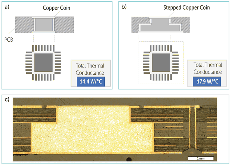 For many leading-edge applications the total thermal conductances shown in Figure 2 are not up to the task. A more effective approach is to use copper coins that are integrated into the circuit’s structure. For ease of comparison, a simple approach is shown in Figure 3 a), where a 6 mm x 6 mm square coin is modelled.