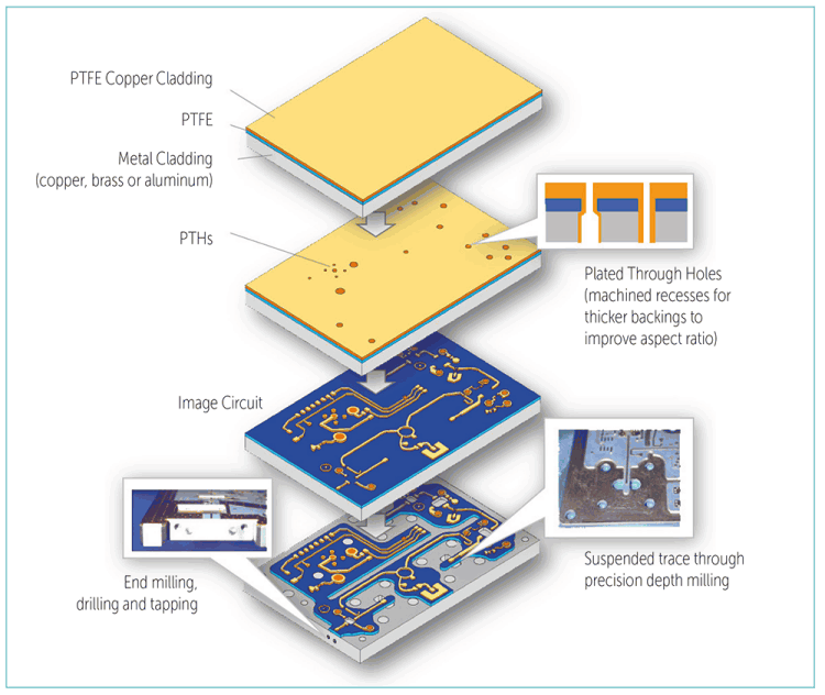 Ultimately, metal backed circuits offer an ideal solution where large amounts of thermal energy need to be dissipated, as shown in Figure 4. The metal backing can be copper, aluminium or brass, as this type of circuit is typically used for solid-state power amplifiers (SSPA) and can be of either pre-bonded or post-bonded structure.
