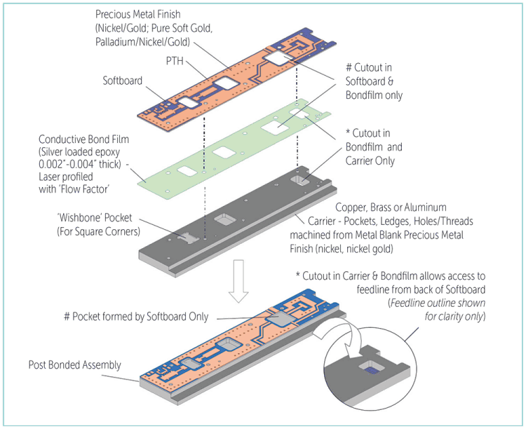 The post-bonded alternative is easier to manufacture insomuch as the circuit is produced and verified before being attached to a pre-machined and plated metal backer as shown in Figure 5. Post-bonded circuits can have more than a single layer of conductors. Generally, the circuit is bonded to the metal backer using a conductive adhesive layer. For both pre- and post-bonded circuits the components that require heat to be transferred away are mounted directly onto the metal backer through openings within the circuit.