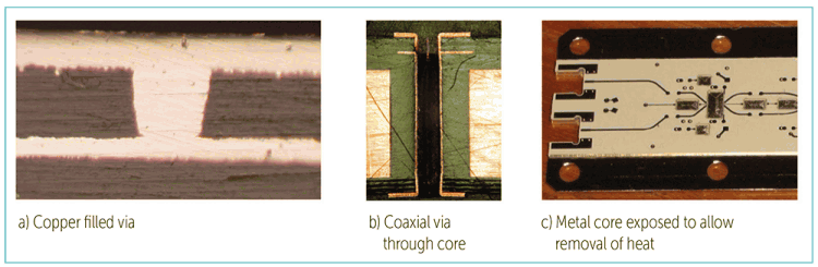 A more complex solution is metal-cored circuits. These can be usefully employed where space is limited and high isolation between RF and control is required in addition to thermal management. Heat being transferred from components to the core can either be through thermal vias or by direct contact through cavities within the circuit that the components are mounted on.