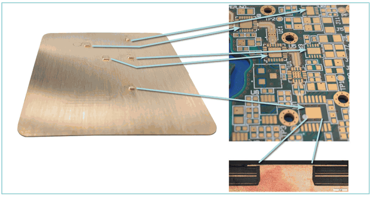 Another technique developed by Teledyne Labtech for thermal management on small circuits (smaller than 25 cm2) – and where the overall thickness is limited yet several devices require thermal management – is to employ a machined copper plane with up-stands (pillars). This provides an excellent thermal pathway and the heat can be distributed efficiently through the thermal plane for transmission to a cold wall. An example is shown in Figure 7.