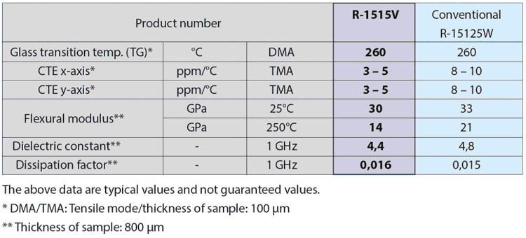1. Low thermal expansion coefficient (CTE) – close to that of silicon IC chips – reduces warping and addresses a critical challenge with the IC chip packaging process. By using the resin design expertise honed over decades of electronic circuit board materials development, Panasonic has developed a material with a low thermal expansion coefficient of 4 ppm (measured by the company), close to the thermal expansion coefficient of semiconductor ICs. This reduces warping caused by the difference in CTE between the substrate and the ICs and improves the reliability of mounting the chips on the substrate.