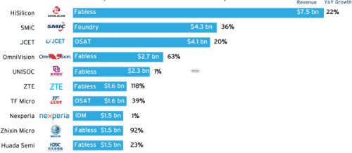 Across all four subsegments of the Chinese semiconductor supply chain – fabless, IDM, foundry and OSAT – Chinese firms recorded rapid increases in revenue last year, representing annual growth rates of 36%, 23%, 32% and 23%, respectively, based on an SIA analysis (Figure 3). Leading Chinese semiconductor firms are on track to expand domestically and even globally, in several submarkets.
