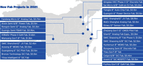 China also maintains robust growth in building out its semiconductor manufacturing supply chain, with 28 additional fab construction projects totalling $26 billion in new planned funding announced in 2021. SMIC and other Chinese semiconductor leaders have further expanded their partnerships with local governments to construct additional joint venture fabs, with a focus on mature technology nodes (Figure 5). Wafer manufacturing startups are continuing to spring up in the trailing-edge fabrication field, backed by government incentives.