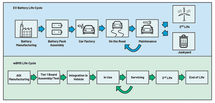 Additional security challenges can arise throughout the EV battery life cycle, as shown in Figure 2. At Analog Devices, the approach to designing wBMS focuses on understanding the different stages an EV battery goes through from birth to factory, to deployment and maintenance and finally to either the next life or end-of-life. These use cases define the various functions a wBMS must support. For example, preventing unauthorised remote access is one consideration during EV deployment, but more flexible access is needed during manufacturing.