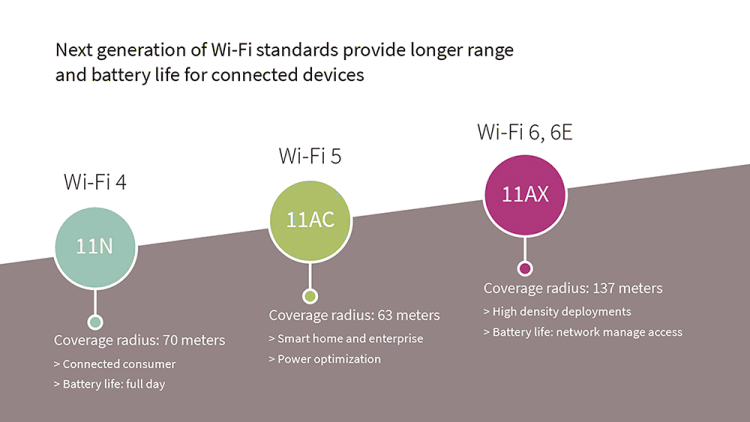 • Range/Congestion. The Wi-Fi 6 standard has a number of features that address range and congestion issues that are important for IoT products.