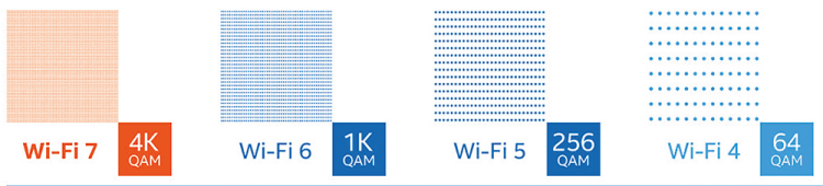 When it comes to arranging the data into packets, Wi-Fi 7 has certainly surged ahead. Whereas Wi-Fi 5 and Wi-Fi 6 used 256-QAM and 1K-QAM respectively, Wi-Fi 7 makes the jump to a 4K-QAM (1024-QAM) scheme, an increase to the physical layer data rate of 20% over Wi-Fi 6.
