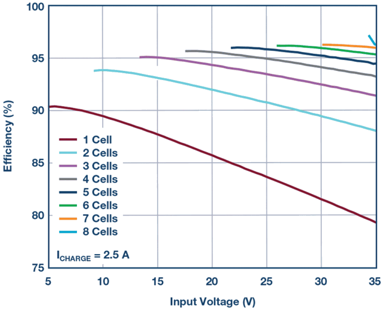 The LTC4162’s onboard charging profiles are optimised for a variety of battery chemistries including Li-ion/polymer, LiFePO4, and LA. Both charge voltage and charge current can be automatically adjusted based on battery temperature to comply with JEITA guidelines or be customised. For LA, a continuous temperature curve automatically adjusts the battery voltage based on the ambient temperature. For all chemistries, an optional die junction temperature regulation system can be engaged, preventing excess heating in space constrained or thermally challenged applications. Figure 2 shows Li-ion charging efficiency.