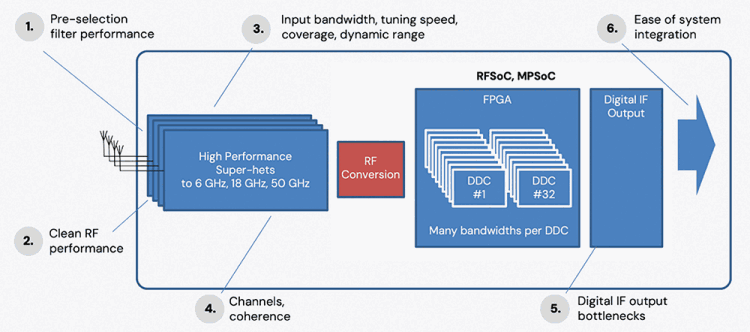 5. A major advantage of conversion to the digital domain is the opportunity to process captured segments of spectrum many ways and focus on many signals of interest. Digital down converters (DDCs) allow this to happen, and an SDR might have 72 DDCs, or even as many as 512 in units with the biggest FPGAs. The downside of all of this is the sheer amount of data that must be transferred, particularly when systems use multiple channels as mentioned above. Modern high performance SDRs use very high-speed serial buses such as 10, 40 or even 100 Gigabit Ethernet (GbE) to pass data, but inevitable bottlenecks in the overall pipeline mean that careful management of DDC settings may be needed.