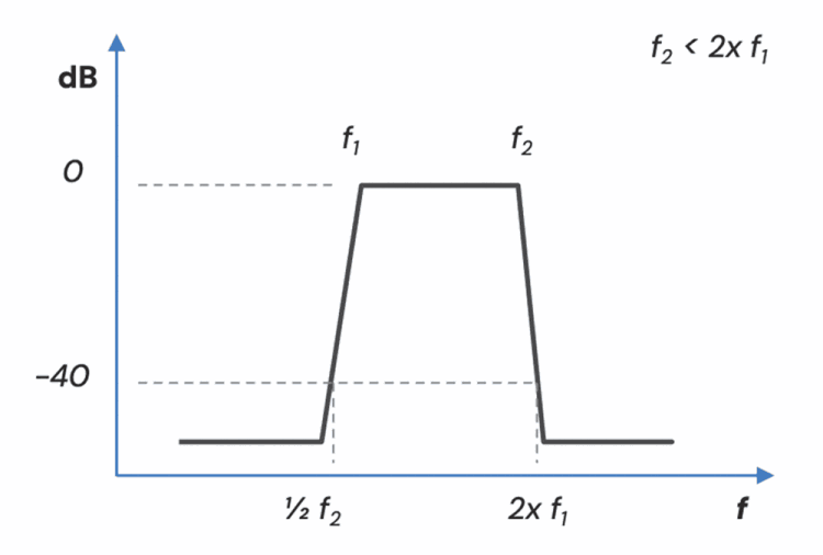 1. In crowded spectral environments, filtering out strong interfering signals adjacent to the one of interest is important, particularly as the latter is usually weak. The inevitable loss penalty of inserting a filter early in the block diagram is usually worth paying when strong unwanted signals left unattenuated will stimulate spur generation in active non-linear devices that follow. Filters are usually sub-octave, such that the upper frequency corner is less than twice the lower frequency corner so that harmonics of the lowest frequency passed receive some attenuation. Requirements for the highest performance systems can be quite exacting, as shown in figure 2.