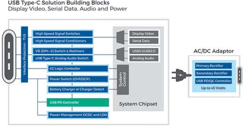 A diagram of a USB Type-C solution with relevant offerings by Diodes Incorporated is shown in Figure 4. Active cables will also be prevalent, which would have repeaters embedded within them. The speed of the data passing through the cable, so close to power, will inevitably introduce transients.